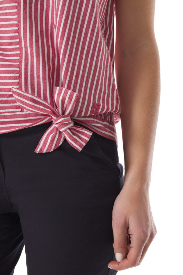 Démarquez-vous avec cette blouse rayée à manches courtes ! Les rayures verticales et le nœud à la taille donnent à ce modèle un style vintage très féminin. Avec sa matière respirante en chambray et et ses manches courtes, c’est le haut idéal pour une balade ensoleillée le long de la plage.